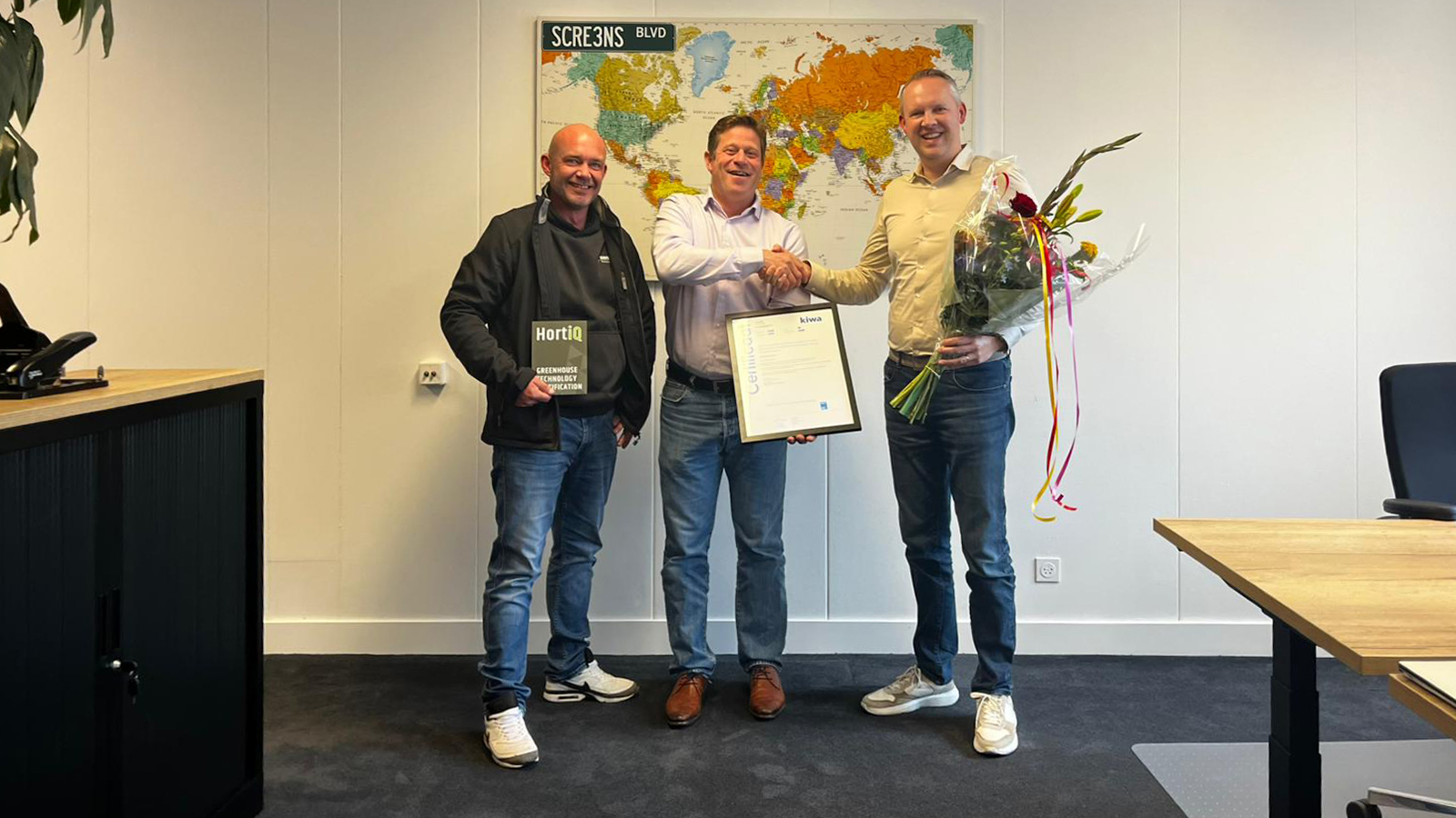 Scherminstallateur SCRE3NS heeft het HortiQ-keurmerk ontvangen. De erkenning werd op maandag 6 oktober uitgereikt door HortiQ-voorzitter Hans van der Salm. Met deze certificering voldoet SCRE3NS aan de objectieve kwaliteitsnormen voor ontwerp, aanleg en installatie binnen de glastuinbouwsector.